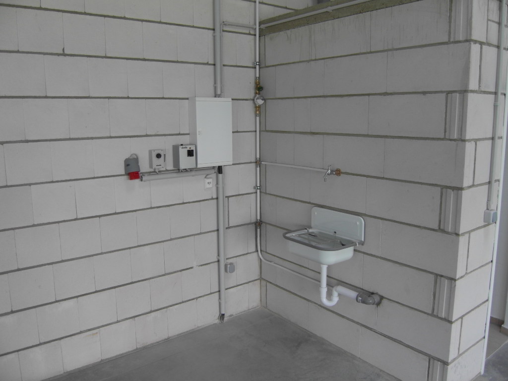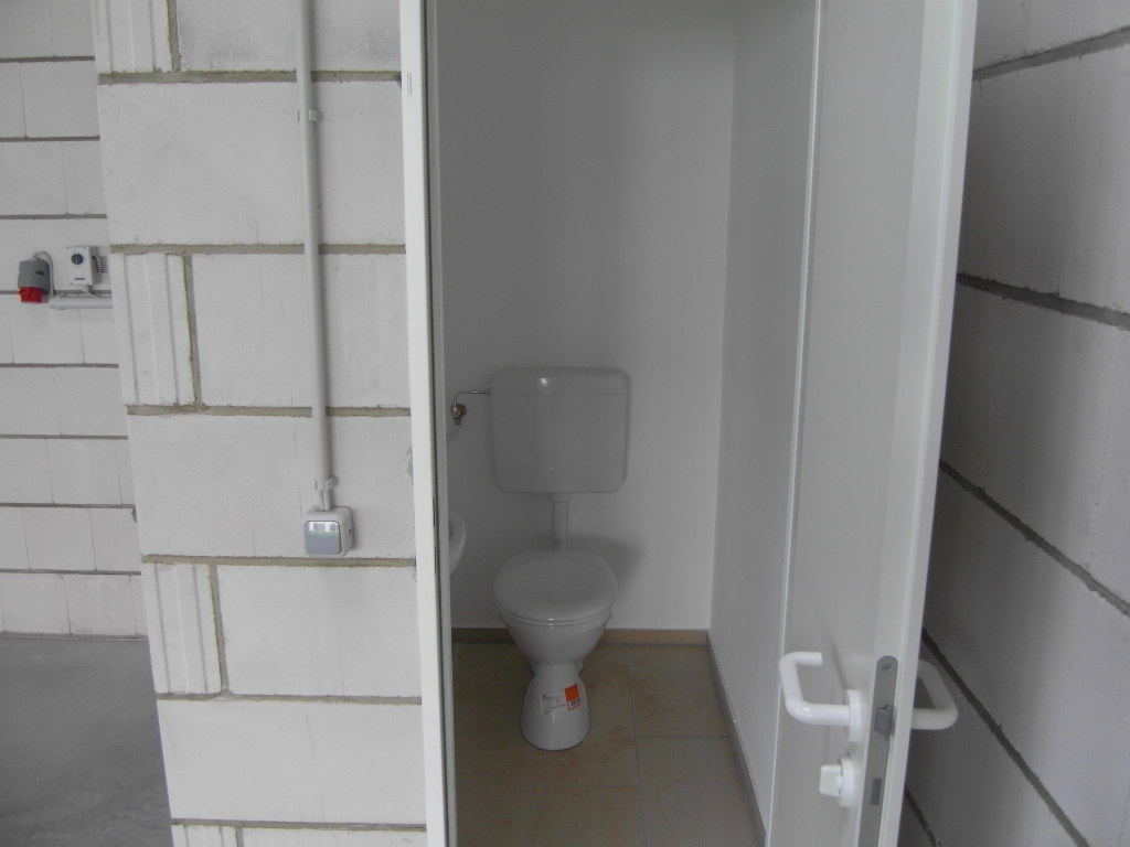 - Je 100 qm Halle 1 Toilette, Größe ca. 1,2 x 1,7 m, Stand-WC, Waschtisch mit Kaltwasserbatterie, Spiegel.